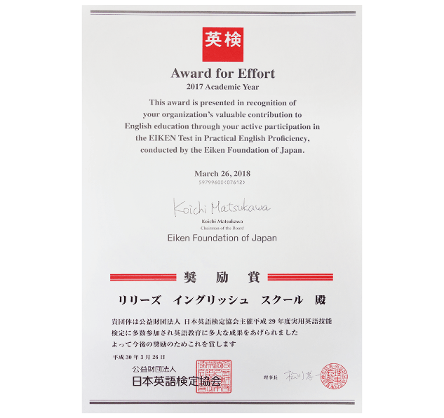 リリーズイングリッシュスクールは、財団法人 日本英語検定協会(後援:文部科学省)の、準会場資格登録校です。