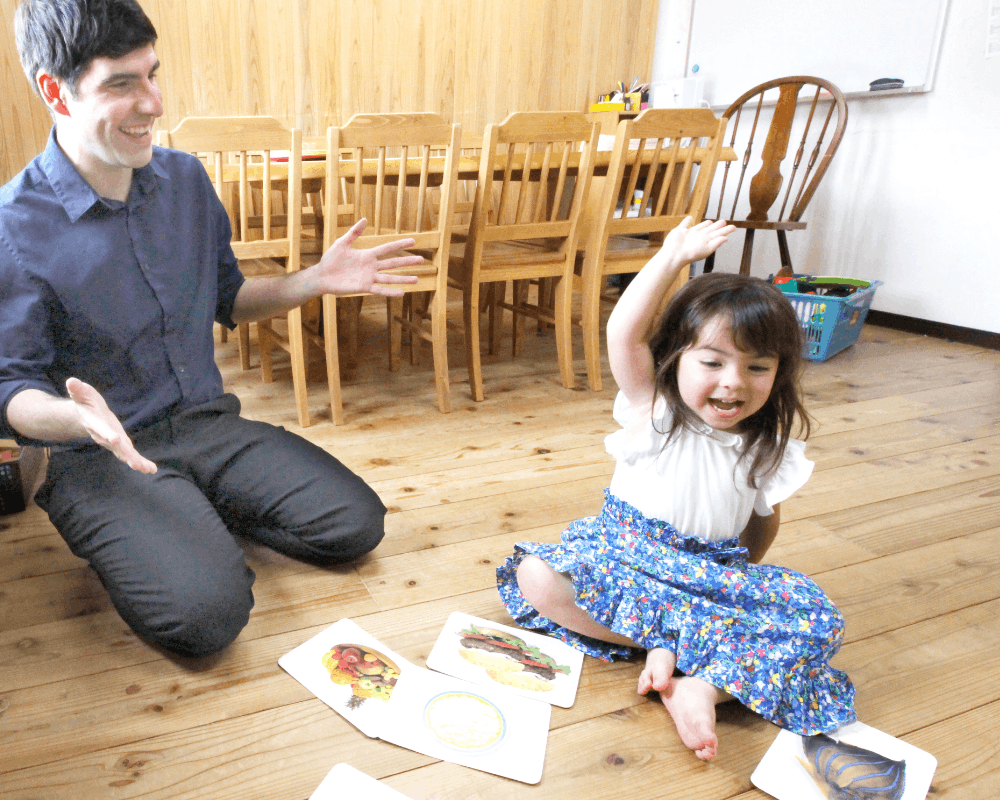 元気で優しいクリス先生がなまりのない美しいアメリカ英語でたくさん話しかけてくれます。子どもを飽きさせない工夫がいっぱいです。親御さまも一緒に楽しいひと時が過ごせます。